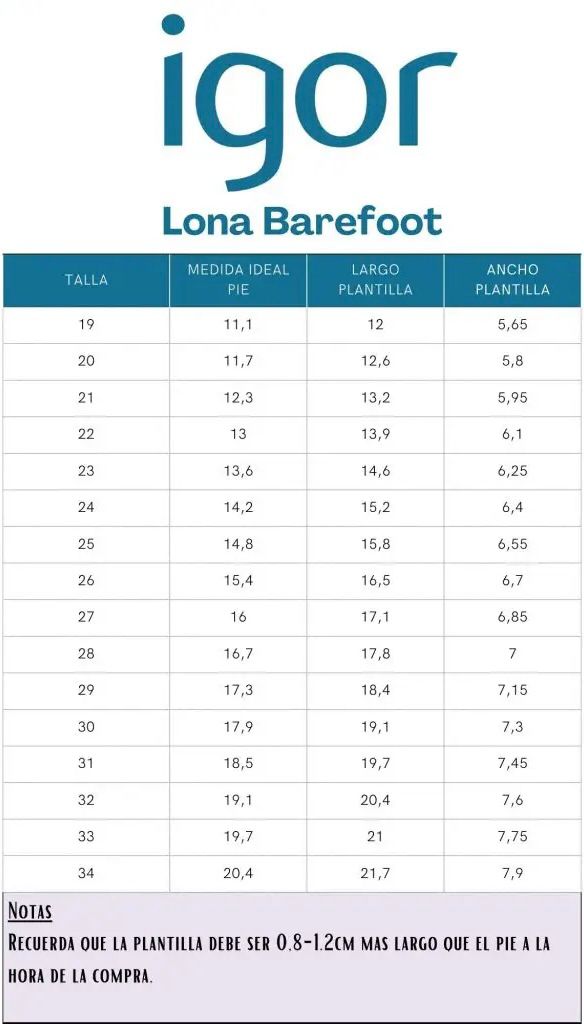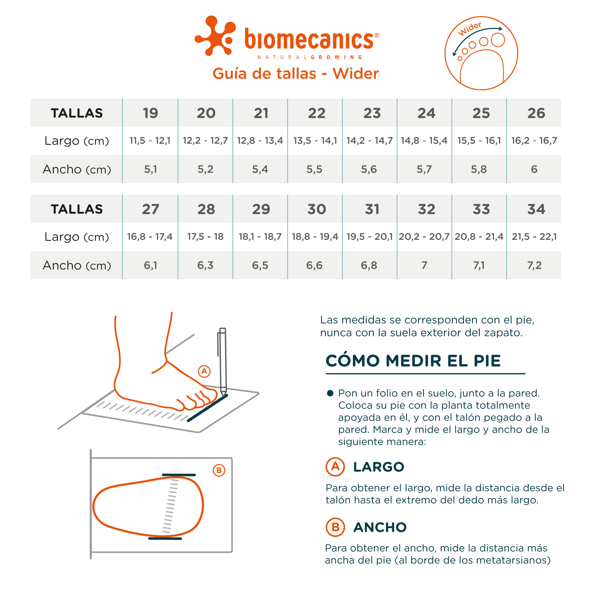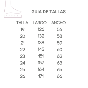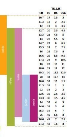 - No olvides tener en cuenta que las medidas de las tablas corresponden al pie. Si utilizara plantillas se ha de tener en cuenta el espacio libre recomendado que es de unos 5 milímetros Con todas estas recomendaciones esperamos que encuentres la talla adecuada y perfecta. Pero no olvides, que en Calzados Pasitos te esperamos para asesorarte y aconsejarte personalmente cuando quieras. Estamos encantados de recibirte.