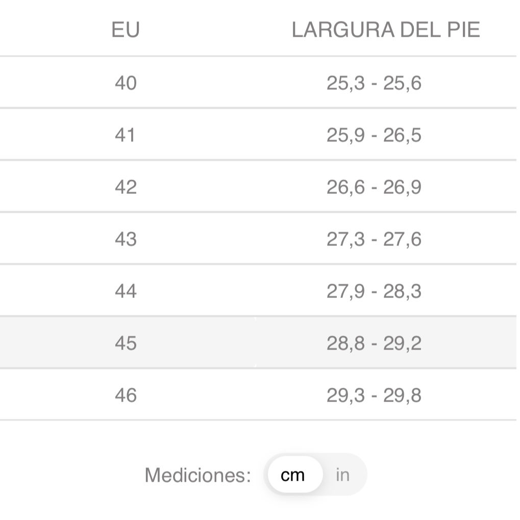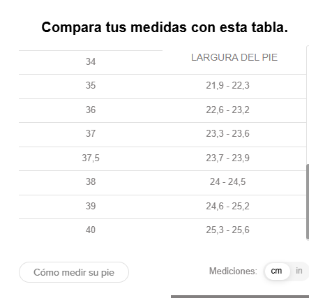 - Busca la medida del pie más largo en nuestras tablas de equivalencias, dependiendo de la marca que quieras comprar pues cada fabricante varía un poco